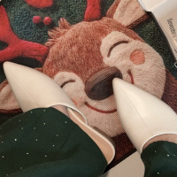 Если ваша новогодняя ночь пройдет в гостях или в доме на природе, можно выбрать смелый наряд – например, зеленый (самый новогодний цвет!) костюм с искрой и белые мюли, которые уместны для вечернего выхода, но остаются удобными и практичными.