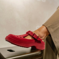 Если вы предпочитаете лаконичную одежду — дайте обуви право быть акцентом образа. На фоне нейтрального костюма в цвете камня или асфальта темно-бордовые клоги выглядят особенно выразительно.