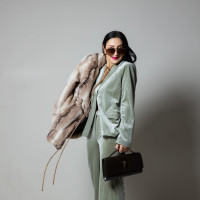 В центре следующего образа — велюровый брючный костюм в сложном шалфейном оттенке: мягком, утонченном и очень «зимнем», полушубок из искусственного меха под норку, который идеально поддерживает цветовую гамму и усиливает ощущение глубины и мягкости образа, и в качестве украшения — золотой шнур-ремень, который использован как чокер-галстук.